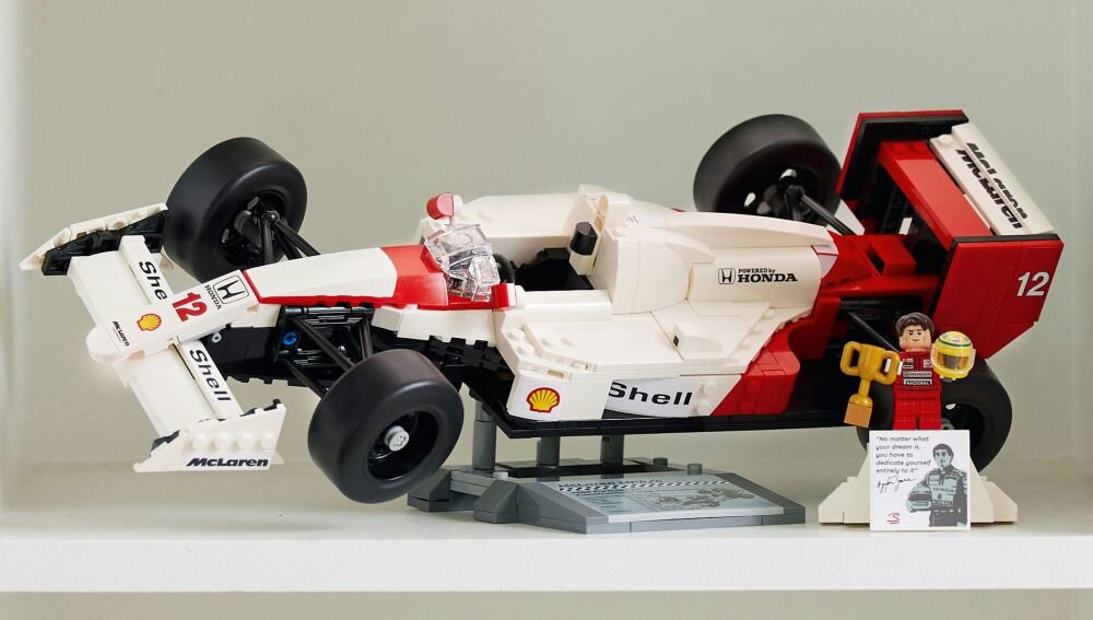 Replika samochodu McLaren MP4/4 ma działający układ kierowniczy, zawieszenie wahaczowe, regulowane tylne skrzydło, opony slicki, lusterka, dźwignię zmiany biegów i szczegółowy silnik V6 turbo. Całość uzupełnia podstawka do ekspozycji z plakietką z ciekawymi statystykami. Minifigurkę Ayrtona Senny można ustawić na podstawce w kształcie podium i dopełnić plakietką z kultowym cytatem kierowcy i jego zdjęciem.