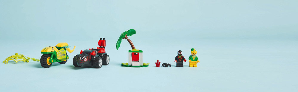 Minifigurki Milesa „Spina” Moralesa i Electro, a także dwa wspaniałe dinopojazdy, gwarantują superbohaterom zabawę bez końca.