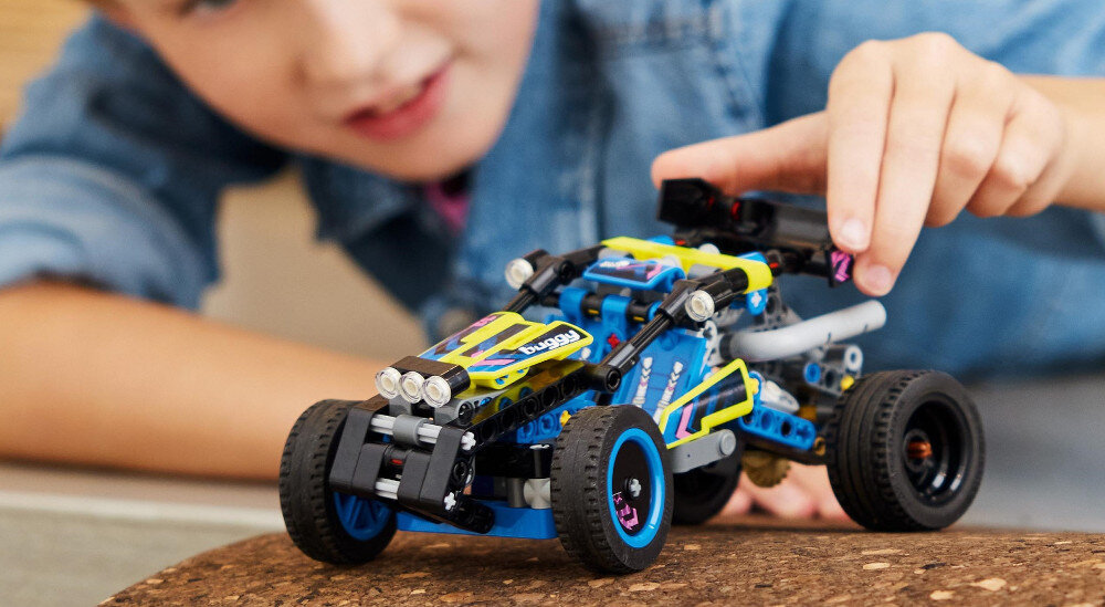 Młodzi konstruktorzy mogą rozwijać swoje umiejętności, składając elementy tego zabawkowego samochodu z zestawu LEGO 42164 Technic Wyścigowy łazik terenowy. Zabawa wspiera kreatywne myślenie, koordynację wzrokowo-ruchową, a także pomaga rozwijać zdolności manualne.