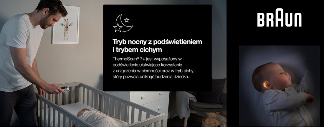 Termometr BRAUN Thermoscan 7+ IRT6525 posiada wbudowaną latarkę, która ułatwia nakierować termometr do kanału usznego podczas badania w nocy. Tryb nocy zapewnia cichą pracę, tak by nie wybudzać dziecka ze snu.
