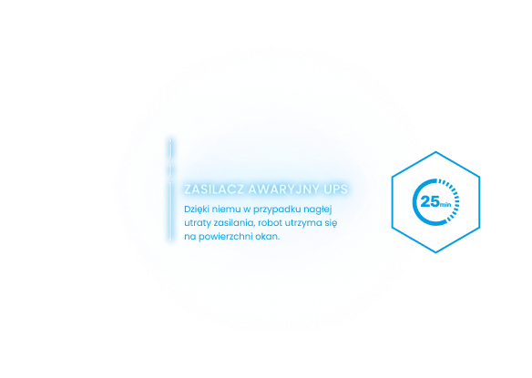 Praca na wysokości wymaga odpowiednich zabezpieczeń, dlatego robot SETTI+ WC700 został wyposażony w zaawansowany, czteropoziomowy system ochrony. Wbudowany akumulator awaryjny UPS podtrzymuje urządzenie na szybie nawet przez 25 minut po utracie zasilania, dając czas na bezpieczne zdjęcie go. Dodatkową ochronę stanowi dołączona do zestawu lina bezpieczeństwa o długości 5 m. System inteligentnego wykrywania ramek zapobiega zjechaniu z krawędzi okna, a funkcja automatycznego zwiększania siły ssania aktywuje się, gdy urządzenie wyczuje ryzyko osunięcia, natychmiast stabilizując jego pozycję.