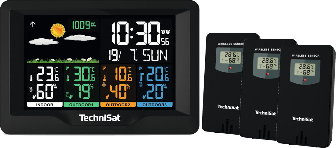 Urządzenie przygotowane przez firmę TECHNISAT ma za zadanie z wielką dokładnością przekazywać użytkownikowi informacje na temat aktualnych i przyszłych warunków atmosferycznych. Z tego powodu w skład zestawu wchodzą aż cztery elementy. Pierwszym jest urządzenie główne, z dużym wyświetlaczem LCD w kolorze czarnym. Sprzęt ma kształt prostokąta i nie jest zbyt duży.