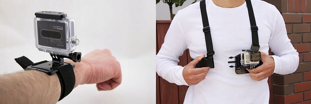 Chest Mount - uchwyt na klatkę piersiową, Head Mount - Uchwyt na kask/głowę, monopod - wysięgnik/ramię teleskopowe, bojka - uchwyt wypornościowy do kamer, uchwyt rowerowy wraz ze śrubą mocującą, zestaw oryginalnych przylepców i mocowań 3M, futerał na kamerę i akcesoria, profilowana szybko-złączka J-hook, adapter statywowy na gwint 1/4", zestaw elementów przedłużających ze śrubami, uchwyt na przyssawce, uchwyt nadgarstkowy, mini statyw elastyczny, klucz montażowy, dokumentacja.