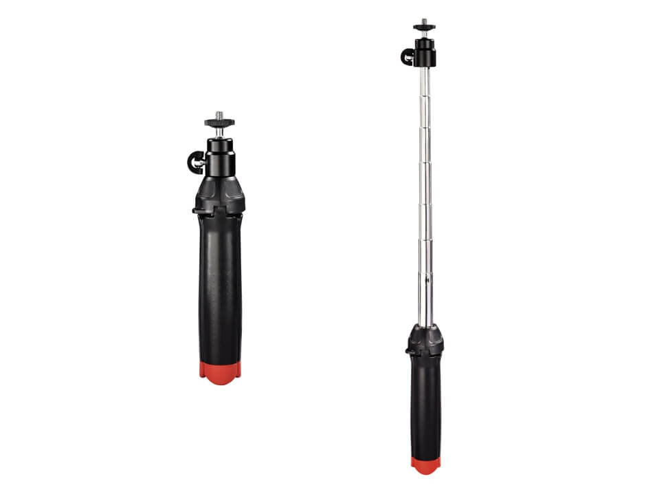 Dzięki różnym końcówkom możesz używać tego statywu do robienia zdjęć smartfonem oraz aparatami mocowanymi na gwint ¼ cala. Teleskopowy, rozsuwany uchwyt zapewnia funkcjonalność selfie sticka i pozwala na uchwycenie ujęć z dalszej odległości. Ponadto końcówka do mocowania kamer GoPro daje możliwość na wygodne nagrywanie filmów.