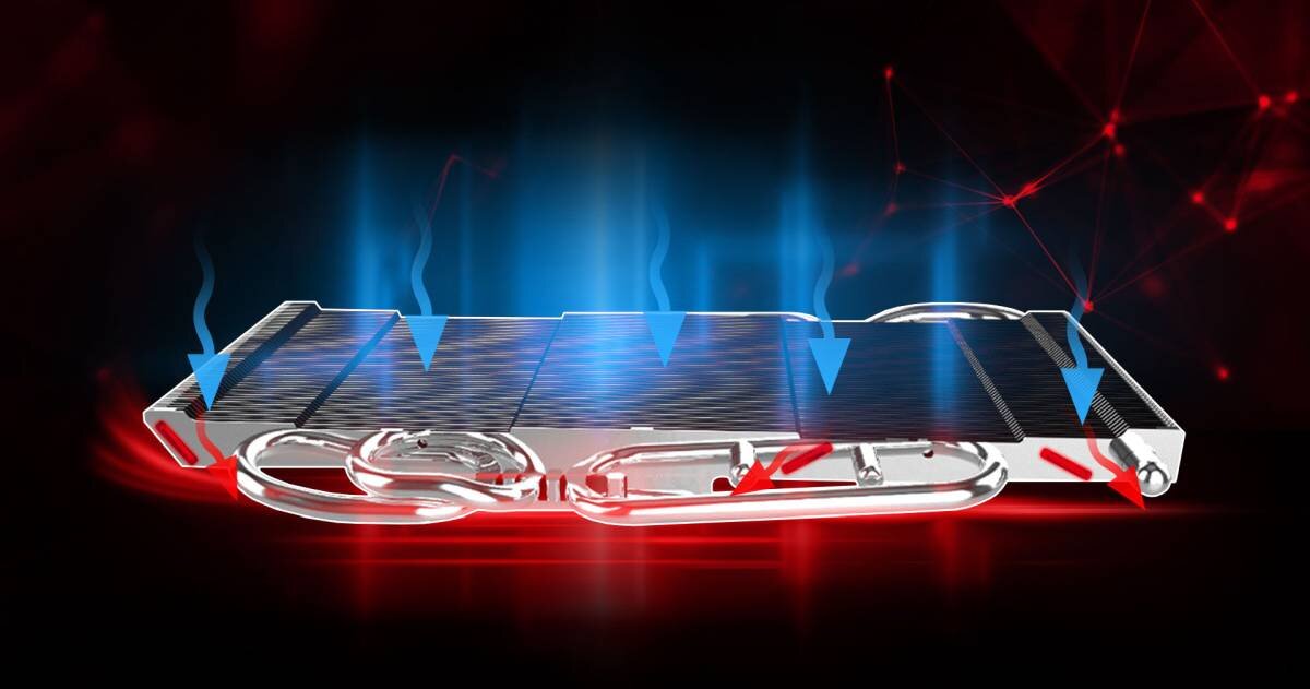 Korzystająca z zaawansowanej aerodynamiki technologia sterowania przepływem powietrza, kieruje większą jego objętość bezpośrednio na ciepłowody (heat pipe) systemu TWIN FROZR VI. Specjalne deflektory umieszczone na radiatorze zwiększają powierzchnię chłodzącą, dzięki czemu poprawia się sprawność chłodzenia, co z kolei przekłada się na niższą temperaturę pracy i lepszy komfort gry.