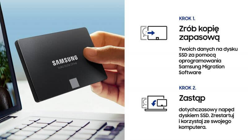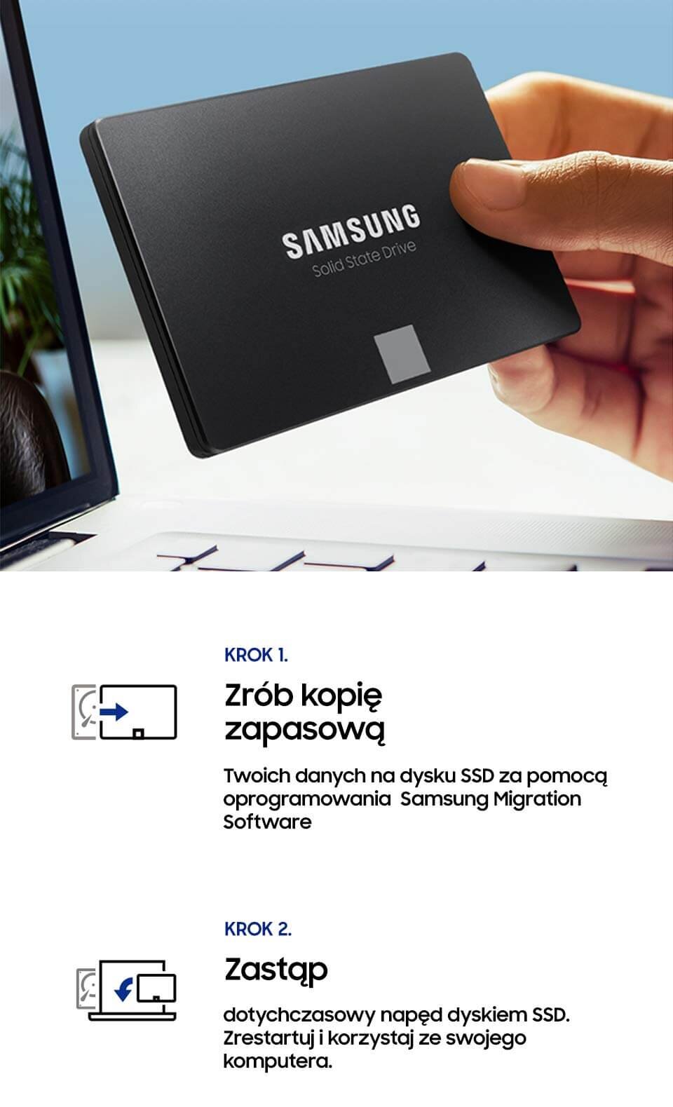 Jeśli posiadasz komputer lub laptop obsługujący standard SATA o wielkości 2,5’’, przeniesienie danych nie sprawi Ci problemów. Podłącz do swojego sprzętu dysk SSD 870 EVO i poczekaj aż nowe oprogramowanie migracyjne wykona całą pracę za Ciebie.