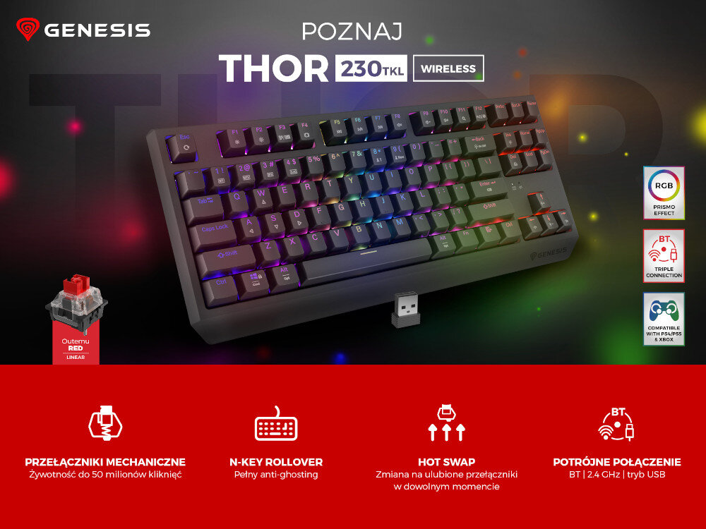 GENESIS Thor 230 TKL został wyposażony w liniowe przełączniki Outemu Red, cechujące się wysoką precyzją oraz dynamiką. Natomiast każdy gracz może mieć swoje własne preferencje. Dlatego właśnie w GENESIS Thor 230 TKL zastosowano technologię hot-swap, która umożliwia wymianę dowolnego 3-pinowego mechanizmu na mikroprzełącznik oferowany przez firmy takie jak OUTEMU, AKKO czy KTT. Wystarczy wyjąć zamontowany mechanizm i wpiąć nowy. Dzięki systemowi Hot Swap nie musisz kupować nowej klawiatury w przypadku awarii jednego przełącznika.