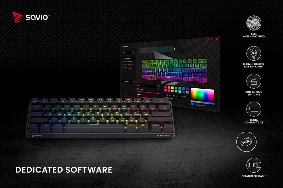 Do klawiatury BLACKOUT stworzono dedykowane oprogramowanie, dzięki któremu masz dostęp do zaawansowanych funkcji takich jak ustawienia makro, konfiguracja podświetlenia czy też tworzenia własnych profili dla gier. Dodatkowo klawiatura posiada wbudowaną pamięć, co sprawia, że raz przypisane ustawienia zostaną zapamiętane nawet po odłączeniu klawiatury.
