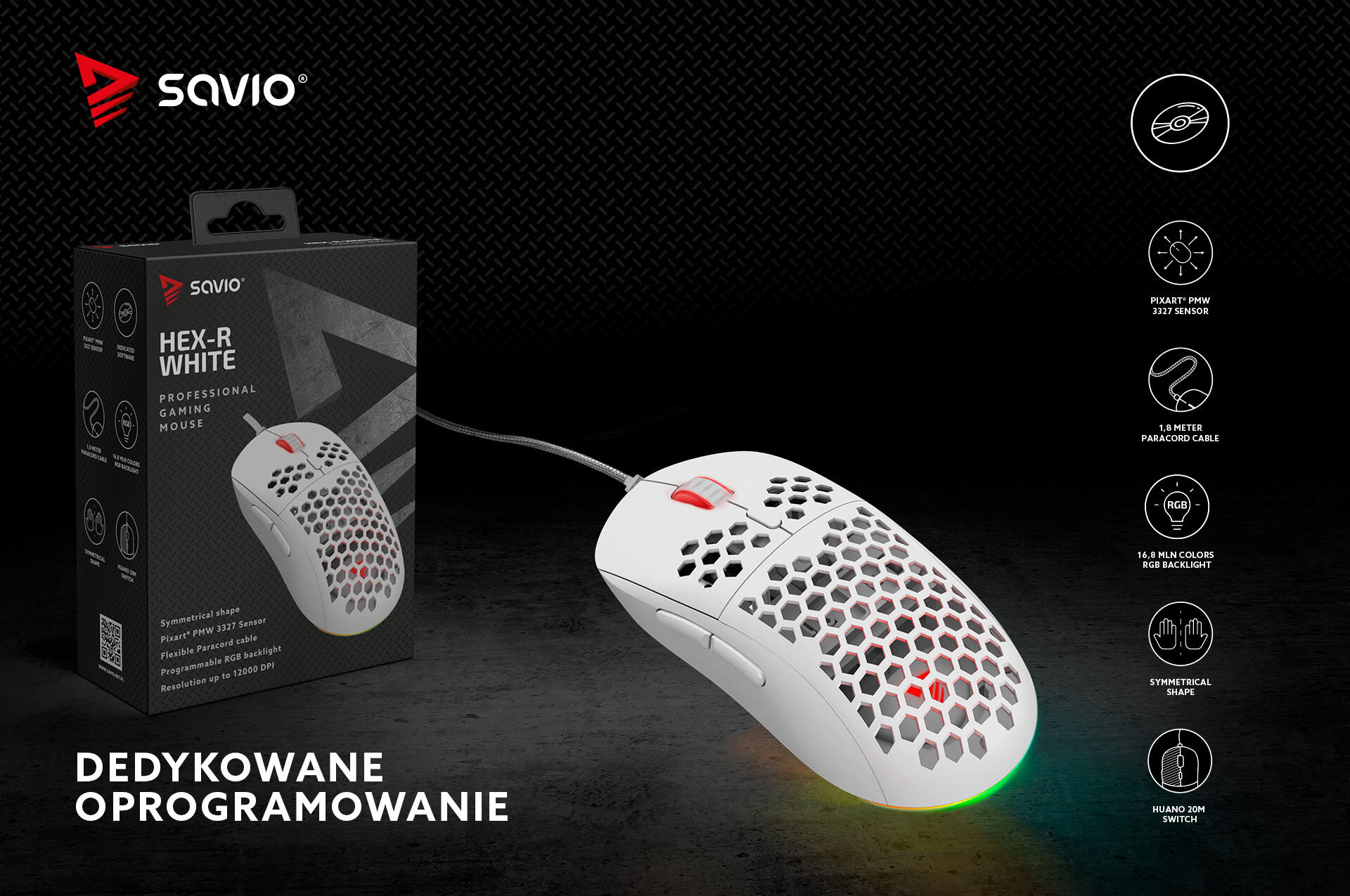 Korpus myszki SAVIO HEX-R został wykonany w strukturze plastra miodu co znacząco poprawia komfort dłoni, a także obniża wagę myszki. Wszystkie elektroniczne elementy znajdujące się pod korpusem zostały pokryte specjalną powłoką ochronną. Takie rozwiązanie na płytce PCB i elektronice zapewnia odporność na kurz i wilgoć.