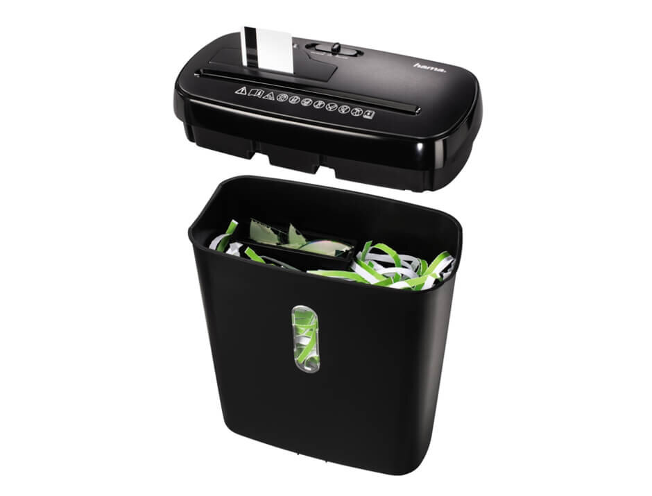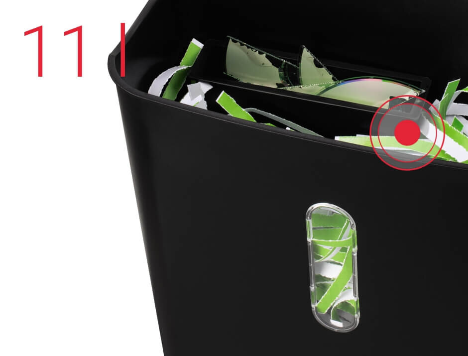 Kawałki zniszczonych dokumentów spadają do kosza o wielkości 11 L. Ma on przezroczyste okienko, dzięki któremu możesz szybko sprawdzić, czy pojemnik już jest pełny. Niszczarka ma osobny wlot dla kart i płyt oraz osobny pojemnik na plastikowe odpady o wielkości 0,6 l. Dzięki temu z łatwością możesz segregować odpady.