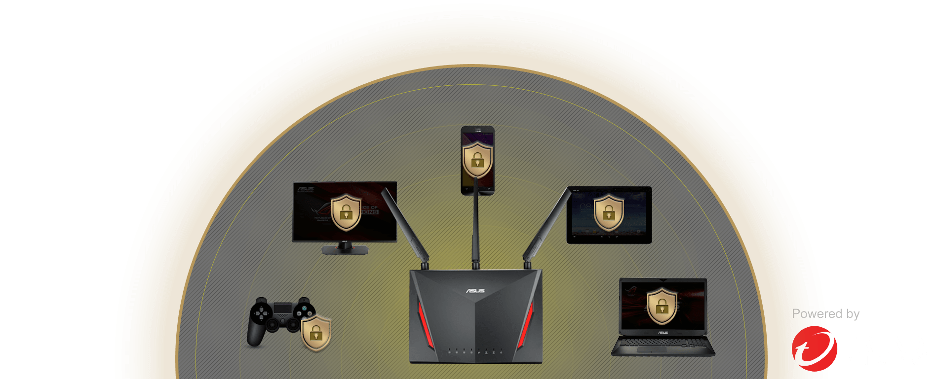 RT-AC86U oferuje również ASUS AiProtection, pakiet oprogramowania bezpieczeństwa sieci o klasie komercyjnej napędzany przez Trend Micro™ Smart Home Network. Dzięki zastosowaniu AiProtection chronione są wszystkie podłączone do sieci urządzenia, nawet jeśli nie dysponują one własnym oprogramowaniem antywirusowym, takie jak np. urządzenia typu IoT. AiProtection blokuje najbardziej rozpowszechnione ataki pochodzące z Internetu jeszcze zanim dotrą one do sieci, a jeśli już zostanie wykryte jakieś zainfekowane urządzenie, AiProtection natychmiastowo je zablokuje, aby zapobiec przesyłaniu osobistych danych do wrogich serwerów.