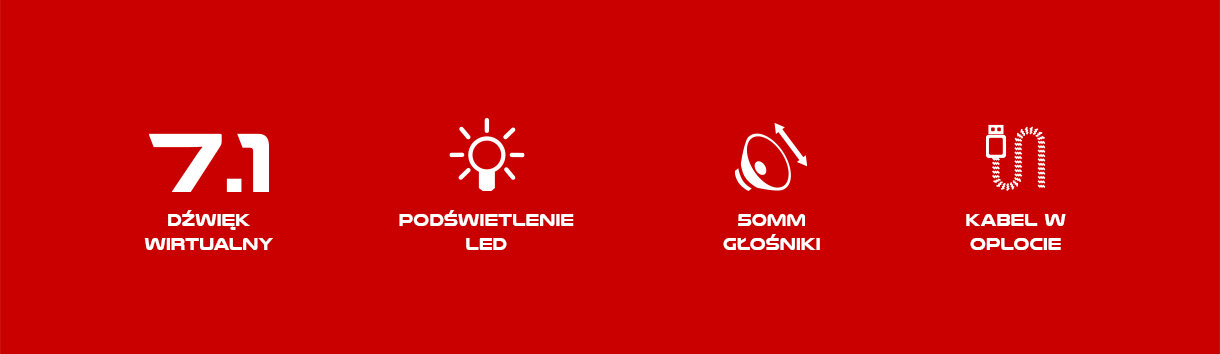 | Dodatkowe informacje: | Kabel w oplocie, Mikrofon na wysięgniku, Podświetlenie LED na nausznikach |