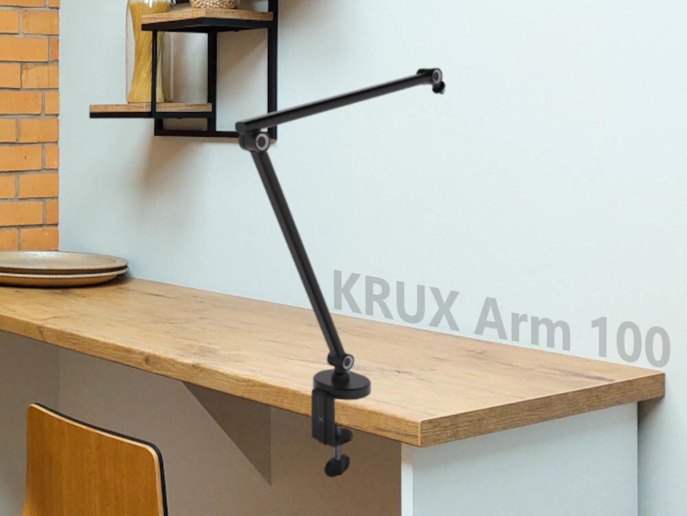 KRUX Arm 100 jest tak wszechstronny, że ostatnio Johnny zadzwonił z pytaniem, czy produkujemy również srebrne wersje. Zasięg tego statywu wynosi 790 mm w każdą stronę od podstawy. Działa on doskonale zarówno przy małych, ciasnych biurkach, jak i przy większych stacjach, gdzie zachowanie minimalistycznego wyglądu i pozostawienie dużo otwartej przestrzeni jest kluczowe.