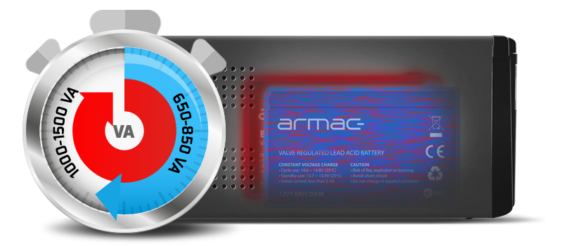 Dłuższy czas podtrzymania Wielu użytkowników stawia urządzeniom zasilania awaryjnego zróżnicowane wymagania odnośnie pojemności baterii oraz zakresu ich mocy. Dlatego Armac w ofercie UPS-ów posiada dwa warianty ilości baterii, niezależnie od modelu i serii. W standardowych modelach 650 VA - 850 VA Home i Office została zastosowana 1 bateria, a w modelach 1000 VA - 1500 VA umieszczono 2 baterie co przekłada się na zauważalny dłuższy czas podtrzymania obciążeń, w zakresie od 26% do nawet 37% (w zależności od zastosowanego obciążenia i mocy UPS-a). Dzięki wprowadzeniu dodatkowego wariantu UPS-ów z większą ilością baterii w przypadku zaniku zasilania, nie musisz się martwić (w stosunku do użytkowników posiadających UPS-y z mniejszymi mocami) o kończący się czas podtrzymania podczas trybu bateryjnego. Bez pośpiechu możesz dokończyć słuchanie ulubionego utworu, bezpiecznie i spokojnie zapisać pracę lub ważny projekt na komputerze lub laptopie, zgrać dane z płyty CD/DVD lub NAS-a, czy dokończyć rozmowę telefoniczną lub emocjonującą rozgrywkę. Dłuższy czas, większa swoboda oraz komfort pracy podczas korzystania ze sprzętu w trybie bateryjnym UPS-a jest w zasięgu ręki - wystarczy wybór systemu zasilania awaryjnego z większą mocą.