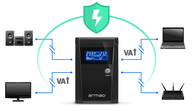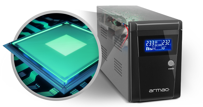 Sterowanie mikroprocesorowe - wysoka wydajność i monitoring wrażliwych urządzeń UPS Armac w pierwszej kolejności chroni Twoje urządzenia przed uszkodzeniami w czasie nagłej awarii zasilania. Nad poprawnym działaniem całości procesu systemu zasilania awaryjnego odpowiada specjalnie wbudowany procesor, który kontroluje parametry samego urządzenia, jego poprawną pracę oraz zasilanie podłączonych obciążeń. Zastosowanie odpowiedniej technologii zintegrowanego sterowania CPU pozwala na natychmiastową reakcję urządzenia korygując niskie lub wysokie napięcia, skoki, przerwy w zasilaniu, przepięcia, przeciążenia UPS-a oraz chroni baterię przed całkowitym wyładowaniem. Dodatkowo technologia ta eliminuje inne anomalia sieci mogące wystąpić podczas korzystania z sieci elektrycznej. Zastosowana w UPS Armac technologia zapewnia również automatyczne ładowanie baterii w trybie Stand-By UPS-a oraz samoczynne uruchomienie po powrocie zasilania sieciowego (bateria jest wyładowana), dzięki czemu urządzenie zapewnia stały komfort użytkownikom poprzez stałe, czyste, bezpieczne zasilanie wszystkich podłączonych obciążeń niezależnie od aktualnego trybu pracy.