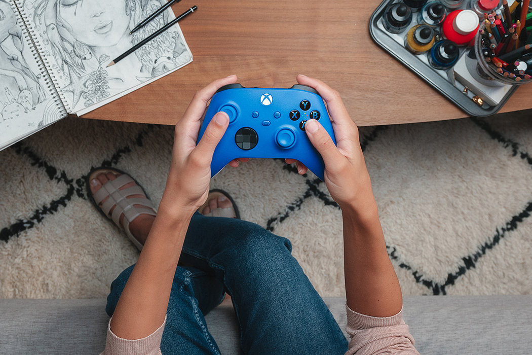 Poznaj kontroler bezprzewodowy Xbox w kolorze piorunującego błękitu o unowocześnionym wyglądzie z precyzyjnie zaprojektowanymi powierzchniami i przeprojektowanym kształtem, zapewniającym Ci większy komfort i bezwysiłkową rozgrywkę, z baterią działającą do 40 godzin*.