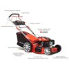 Cała obudowa i kosz na ściętą trawę utrzymana jest w kolorach czarnym i czerwonym. W zestawie z urządzeniem otrzymuje się kosz o pojemności 60 litrów. Zakres regulacji koszenia to od 25 do 75 milimetrów - można to dostosować do zagęszczenia trawy i jej startowej wysokości. Waga kosiarki to aż 38 kilograma, jednak wbudowany napęd sprawia, że jej użytkowanie jest bardzo łatwe i nie wymaga większej tężyzny fizycznej. Szerokość koszenia wynosi 53 centymetry. Można zatem bardzo szybko zadbać o duże połacie trawnika.