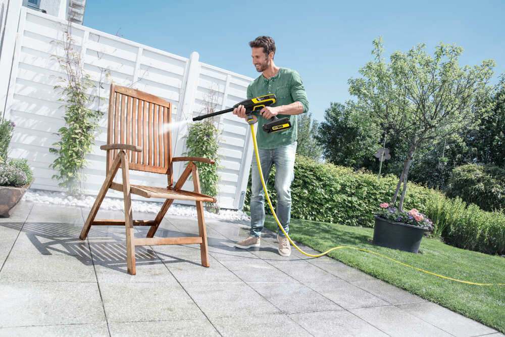 Dzięki delikatnej lancy jednostrumieniowej uporczywe zabrudzenia mogą być szybko usunięte z mebli ogrodowych, zabawek i innych obiektów. Obie dysze, mocna i wymienna bateria litowo-jonowa (18 V / 2,5 Ah) oraz ładowarka są w tej wersji standardowym wyposażeniem.