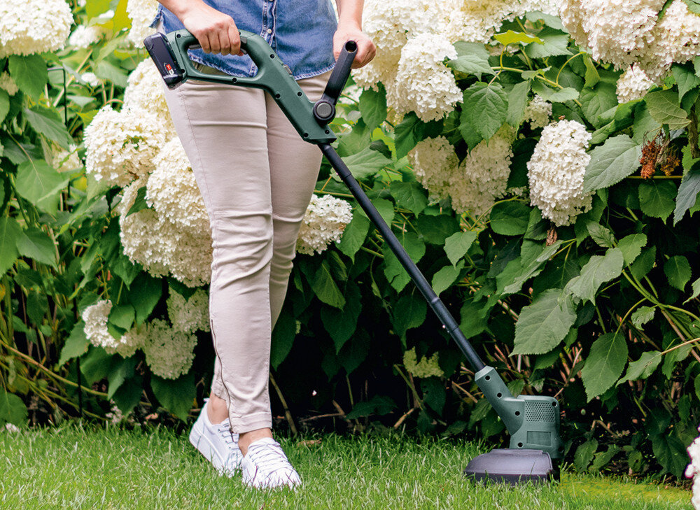Podkaszarka wyposażona jest w funkcję podkaszania w poziomie oraz w pionie. Zmiana między tymi funkcjami odbywa się za pomocą przycisku na górnym uchwycie. Wystarczy, że naciśniesz guzik i obrócisz narzędzie, a głowica ustawi się w pozycji do podkaszania krawędzi. Dzięki takiemu rozwiązaniu możesz wygodnie pracować bez schylania się w celu zmiany funkcji. Jest to bardzo istotne, kiedy trzeba kosić przez dłuższy czas.