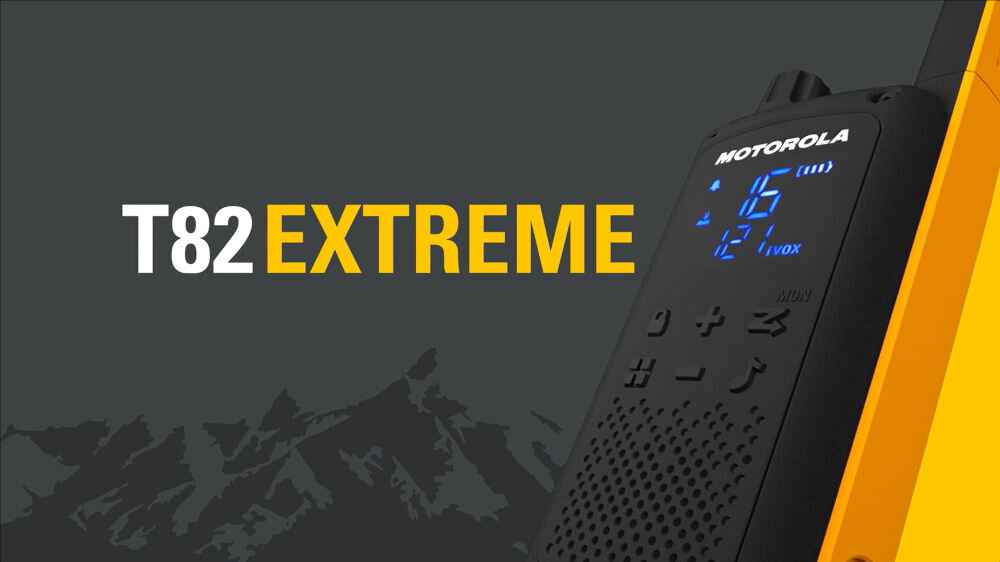 MOTOROLA Talkabout T82 EXTREME to kompaktowy model radiotelefonu w kolorze żółto-czarnym, idealny do użytku w ekstremalnych warunkach. Dzięki pasmu częstotliwości PMR446 oraz mocy nadajnika 500 mW zapewnia zasięg do 10 km (w zależności od terenu i warunków). Wyposażony w 16 kanałów (w Rosji ograniczenie prawne do 8 kanałów) oraz 121 kodów prywatności.