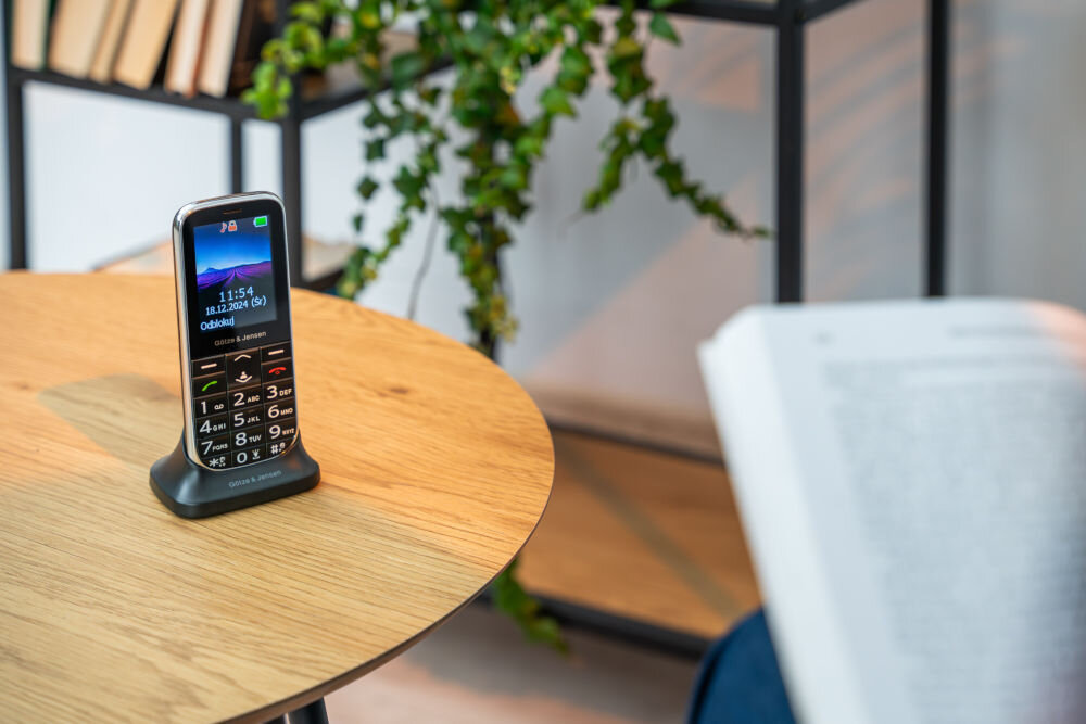 Telefon GSM GÖTZE & JENSEN GFE39, akumulator, baza ładująca, zasilacz z końcówką USB-C, dokumentacja.