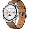 • HUAWEI WATCH GT 4 46 mm Classic: z kopertą w kolorze srebrnym, ze skórzanym paskiem w kolorze brązowym,