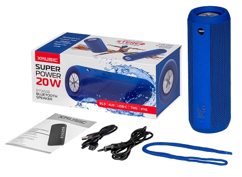 Głośnik mobilny XMUSIC BTS650, przewód USB-A/USB-C, przewód AUX 3,5mm, instrukcja obsługi z warunkami gwarancji.