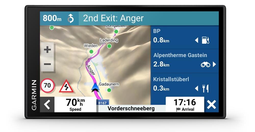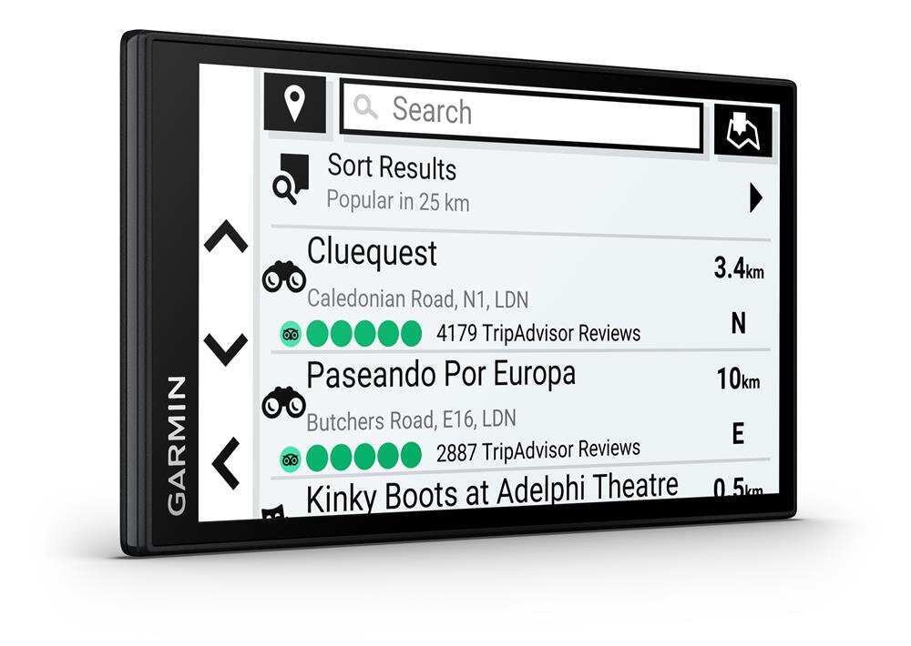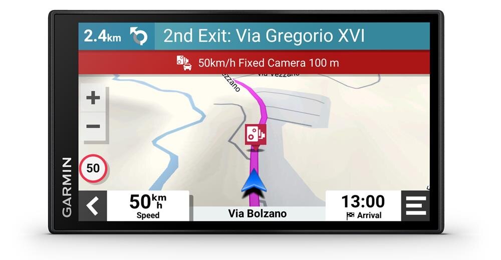 Nawigacja ułatwia jazdę dzięki czytelnym mapom oraz szczegółowym wskazówkom głosowym Garmin Real Directions™. Aby zapewnić maksymalne bezpieczeństwo podczas jazdy nawigacja informuje o ostrych zakrętach, przejazdach kolejowych oraz dużym nachyleniu terenu. Urządzenie przekazuje też wskazówki dotyczące przejazdu przez strefy środowiskowe.