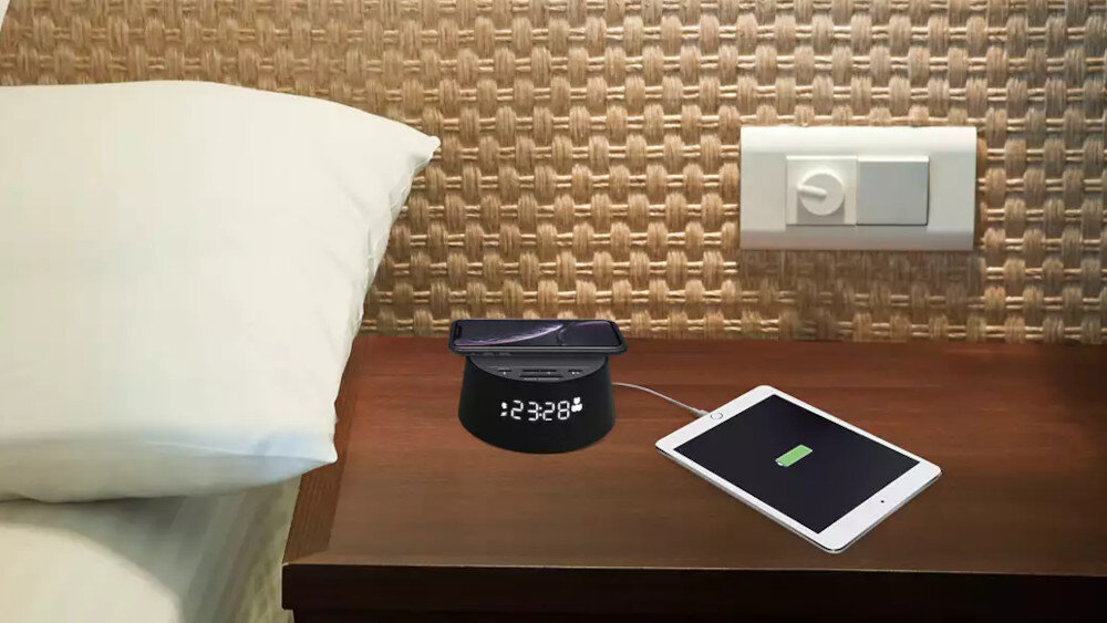 W górnej części urządzenia znajduje się mata Qi, która daje możliwość bezprzewodowego ładowania smartfona. Dzięki temu możesz cieszyć się z dwóch czynności w jednym: słuchać ulubionej muzyki, przesyłanej z telefonu, i jednocześnie mieć zawsze w pełni naładowany telefon. Niespodziewane wyjście z domu to teraz nie problem - masz pewność, że dzięki bezprzewodowej ładowarce w budziku PHILIPS TAPR702/12 Twój smartfon będzie miał pełną baterię.
