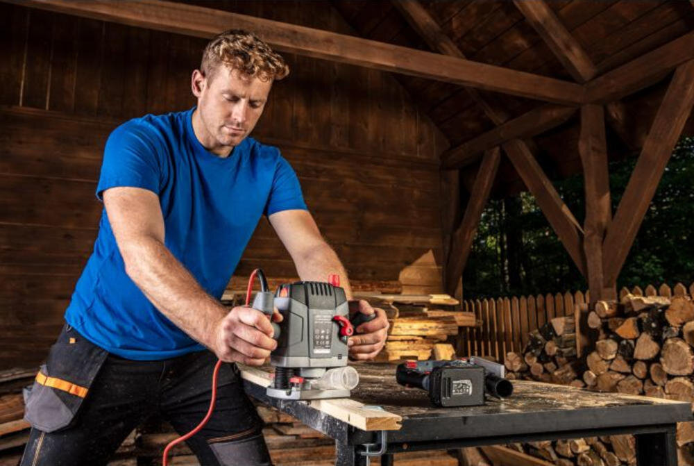 Ergonomiczne rękojeści frezarki zostały pokryte antypoślizgowym materiałem, dzięki czemu operowanie urządzeniem jest komfortowe i bezpieczne. Osłona przeciwpyłowa oraz adapter do odciągu pyłu wykonane zostały z przezroczystego poliwęglanu. Frezarkę wyposażono w duże pokrętło regulacji prędkości, umiejscowione w zasięgu prawego kciuka operatora. Przy lewym chwycie frezarki zlokalizowana jest łukowa, ergonomiczna dźwignia blokady prowadnicy korpusu, umożliwiająca operowanie nią bez odrywania ręki.