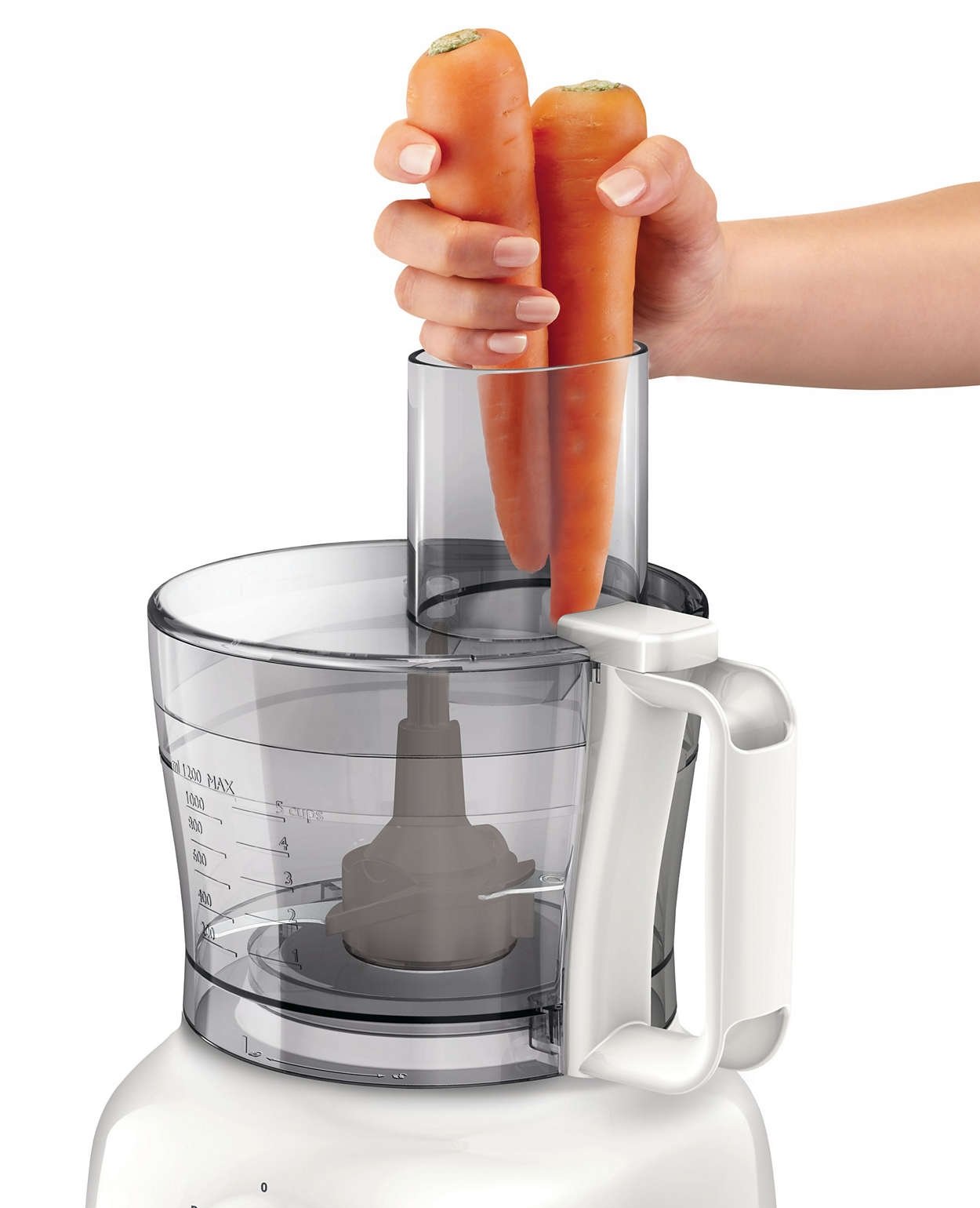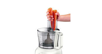 | O 40% większy otwór na produkty (w porównaniu do modelu HR7625 firmy Philips) Otwór na produkty nowego robota kuchennego firmy Philips z serii Daily Collection jest o 40% większy od otworu w poprzednim modelu HR7625, co pozwala wyeliminować konieczność cięcia warzyw i owoców na mniejsze kawałki. |