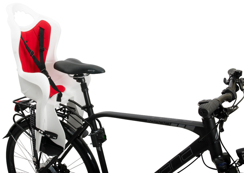 Fotelik mocowany jest za siodełkiem na amortyzującym wysięgniku. Solidny system montażu pozwala na sprawne i szybkie mocowanie oraz zdejmowanie fotelika. Fotelik montowany jest na rurze podsiodłowej.