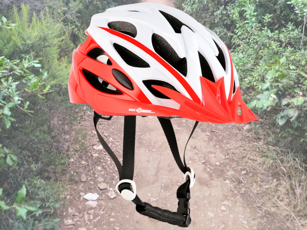 Kask rowerowy NILS EXTREME MTW210 Biało-czerwony w rozmiarze M, regulowany w zakresie od 53 do 58 cm. Dostępny w kilku kolorach i rozmiarach.