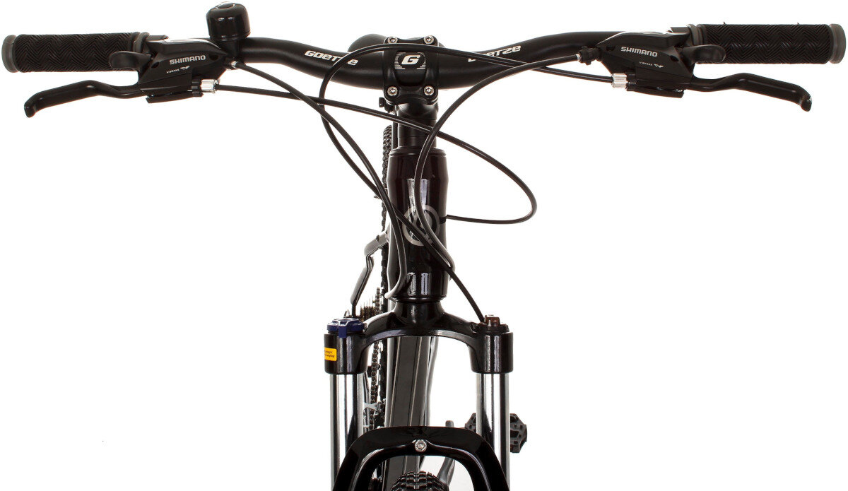 Przednia część roweru MTB GOETZE Define wyposażona została w aluminiowy amortyzator z blokadą marki GOETZE. Minimalizuje on wibracje na kierownicy i ułatwia prowadzenie. Aluminiowa kierownica i wspornik są wytrzymałe, lecz jednocześnie bardzo lekkie.