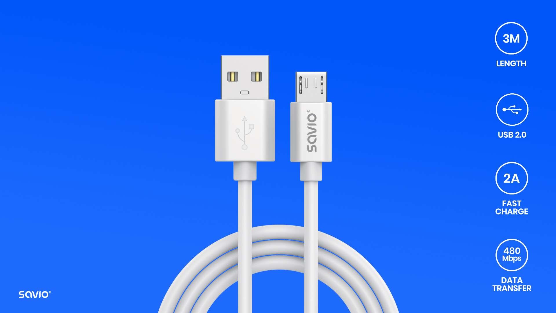 Kabel SAVIO CL-167 USB-A – micro USB-A o długości 3 m z obsługą szybkiego ładowania Fast Charge to przewód nowej generacji gwarantujący płynny transfer, szybsze ładowanie oraz synchronizację danych. Ponadto działa w obie strony.