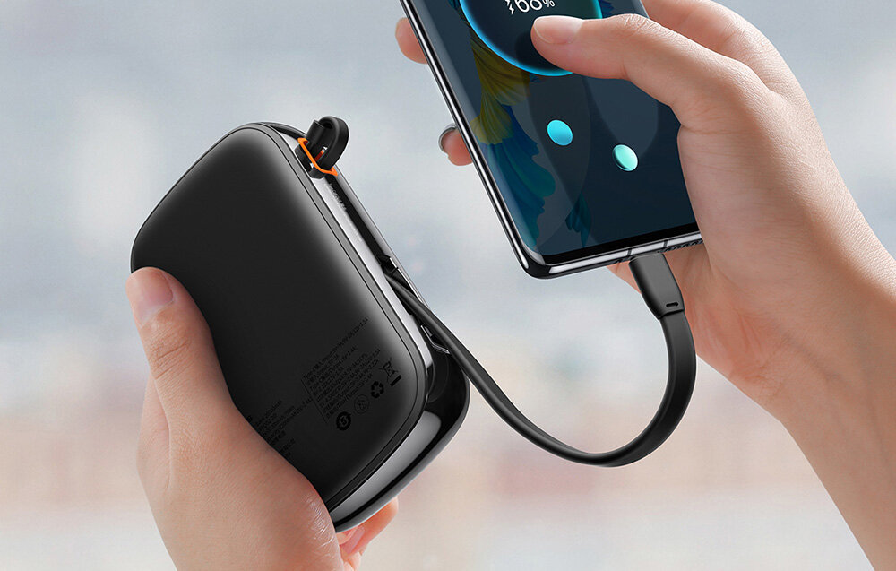 Design powerbanku Baseus Qpow Pro został starannie przemyślany, dlatego korzystanie z niego to czysta przyjemność. Wyświetlacz dostarczy Ci informacji na temat stanu baterii, więc zawsze wiesz, kiedy trzeba go podładować. A waga? Zaledwie 360 g, czyli tyle, co małe jabłko. Bez problemu wrzucisz go do plecaka czy torebki, ponieważ jego wymiary to tylko 123 × 74,6 × 32,8 mm, a co najważniejsze, nawet nie poczujesz, że jest w środku. Praktyczny zaczep umożliwia chowanie końcówki kabla, który powstał z wytrzymałego materiału TPE, więc nie musisz się martwić, że się zepsuje. Co więcej, jego długość sięga aż ok. 19 cm, co sprawia, że będzie komfortowy w użytkowaniu.