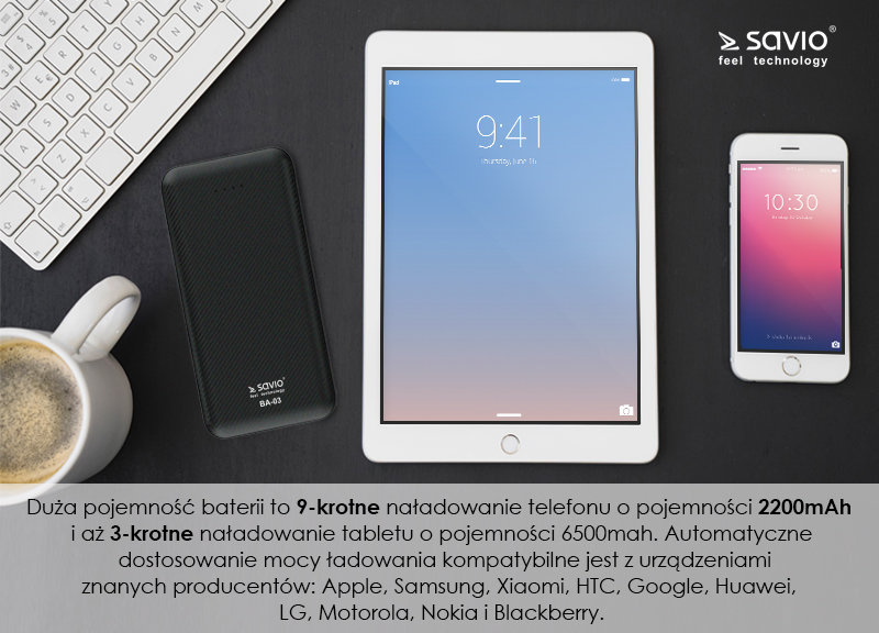 Duża pojemność baterii to 9-krotne naładowanie telefonu o pojemności 2200mAh i aż 3-krotne naładowanie tabletu o pojemności 6500mah. Automatyczne dostosowanie mocy ładowania kompatybilne jest z urządzeniami znanych producentów: Apple, Samsung, Xiaomi, HTC, Google, Huawei, LG, Motorola, Nokia i Blackberry.