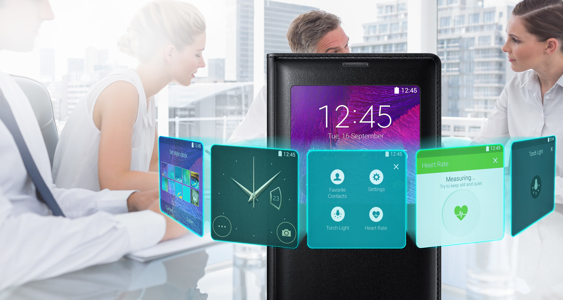 | Wyjątkowe cechy okna S View Etui S View „Classic Edition” do Galaxy Note 4 posiada szerokie przezroczyste okno z przodu, które zapewnia dostęp do wielu funkcji. Podobnie jak w przypadku dotychczasowych modeli, przez okno można obsługiwać odtwarzacz muzyki, zmieniać tapetę, odrzucać połączenia, wysyłać wiadomości i uruchamiać aparat fotograficzny. Dostępne są również dodatkowe funkcje, takie jak szybkie połączenie z jednym z często wybieranych numerów, szybki dostęp do kamery, kontrola pulsu, latarka i inne. |
