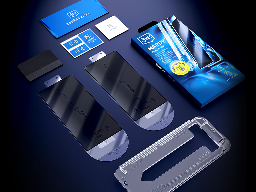 Szkło prywatyzujące 3MK Hardy Privzone 9H (2 szt.) i akcesoria montażowe.