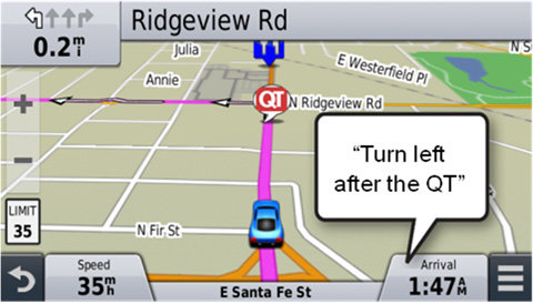 | Nowość! Technologia Garmin Real Directions™ Urządzenie nüvi 58LMT zapewnia nowy wymiar „szczegółowych, wymawianych wskazówek” dzięki funkcji Garmin Real Directions, czyli łatwym w zrozumieniu wskazówkom dojazdu, które prowadzą niczym przyjaciel, wykorzystując rozpoznawalne punkty orientacyjne, budynki i sygnalizację świetlną. Koniec ze stresem podczas prób odczytania nazw ulic. Zamiast tego słuchaj wyraźnie wymawianych wskazówek, na przykład „Skręć w lewo za stacją benzynową”. |