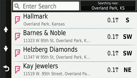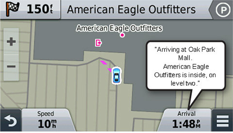 | Nowość! Dokładnie wiesz, gdzie masz się udać Funkcja Direct Access ułatwia nawigację do wybranych złożonych celów podróży, takich jak lotniska czy centra handlowe, dzięki temu, że pozwala wyszukać miejsca w obrębie większego kompleksu. Funkcja Direct Access umożliwia nawet nawigację po parkingach w celu wyszukania wjazdu znajdującego się najbliżej celu podróży. Podczas podróży na zakupy funkcja Direct Access zapewnia dodatkowe informacje o konkretnych sklepach detalicznych znajdujących się w centrum handlowym. Na przykład: „Przybycie do centrum handlowego Woodfield Mall. Kwiaciarnia znajduje się wewnątrz centrum handlowego, na górnym piętrze”. |