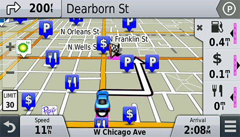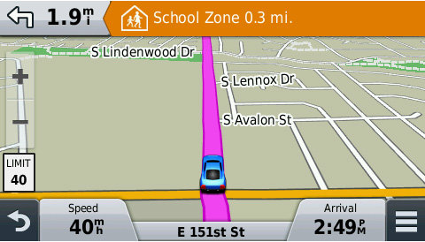 | Więcej informacji widocznych na pierwszy rzut oka Nie trzeba już szukać trudnych do odczytania bądź nieistniejących tablic — wystarczy spojrzeć na urządzenie nüvi 58LMT, aby przeczytać nazwę aktualnej ulicy. Urządzenie nüvi wyświetla też ograniczenie prędkości, aktualną prędkość i czas przybycia. Funkcja „Przed tobą” umożliwia łatwe wyszukiwanie różnych miejsc bez konieczności opuszczania ekranu mapy. Podczas jazdy wybraną trasą funkcja „Przed tobą” stale informuje o usługach w pobliżu, takich jak punkty gastronomiczne, stacje benzynowe i bankomaty. Co najważniejsze, funkcję „Przed tobą” można dostosować, aby zawsze wyświetlała pozycje ulubionych miejsc na trasie. |