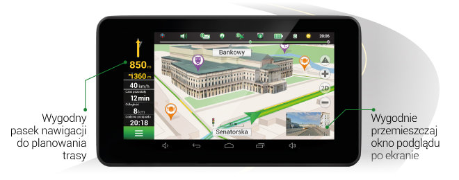 NAVITEL RE900 FULL HD to także nawigacja samochodowa z mapami 43 państw Europy, Rosji, Białorusi, Kazachstanu i Ukrainy.Użytkownik może z nich korzystać w trybie offline, bez konieczności łączenia z siecią.Mapy w aplikacji Navitel Navigator zawierająniezbędne informacje o sieci drogowej, aktualną bazę fotoradarów, punktów POI oraz obiektów 3D. Podczas wyliczania trasy pod uwagę brane są bieżące informacje o ruchu drogowym,które można zobaczyć na ekranie w trybie nawigacji (pod warunkiem umieszczenia w slocie karty SIM, która umożliwia mobilny transfer danych). |