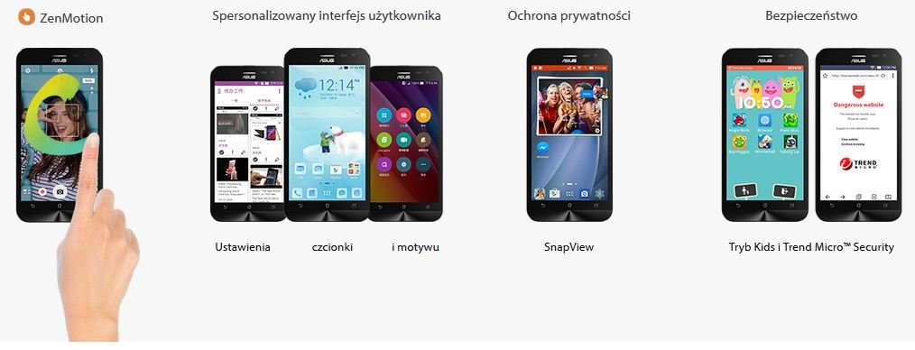 Wolność, łączność i ekspresja stanowią podstawę mobilnego interfejsu użytkownika ASUS ZenUI. Zupełnie nowy ZenUI ma wyrafinowany wygląd i wiele nowych funkcji, w tym ZenMotion, SnapView, Trend Micro™ Security oraz ZenUI Instant Updates, które zwiększają użyteczność, gwarantują bezpieczeństwo i prywatność oraz zapewniają bezproblemowe użytkowanie.