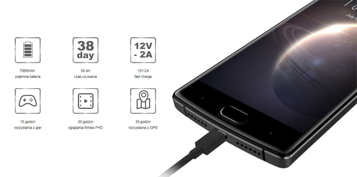 Pojemna bateria Bateria polimerowa o pojemności 7060mAh z funkcją szybkiego ładowania to mocny plus smartfona BL7000. |