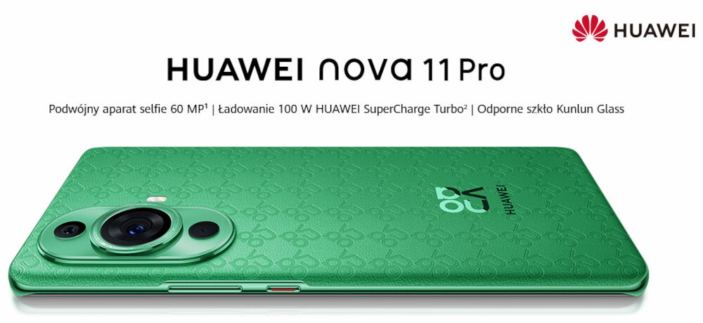 Seria nova od samego początku charakteryzuje się estetyczną formą oraz odważnymi kolorami. W HUAWEI nova 11 Pro zastosowano wysokiej jakości skórę wegańską, ozdobioną unikalnym wzorem, który powstał dzięki symetrycznemu ułożeniu monogramu nova. To pierwszy raz w historii marki, kiedy zastosowano taką formę. Skóra charakteryzuje się przyjemną w dotyku teksturą oraz wysoką odpornością na upadki i codzienne użytkowanie.