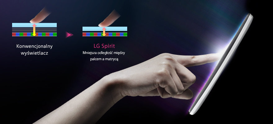 Ze względu na zmniejszoną liczbę warstw oraz zintegrowanie czujników dotyku z 4,7-calowym wyświetlaczem HD, smartfon LG Spirit 4G LTE zapewnia lepszą responsywność oraz wyższą jakość obrazu, wyróżniając się ostrością oraz żywymi kolorami.