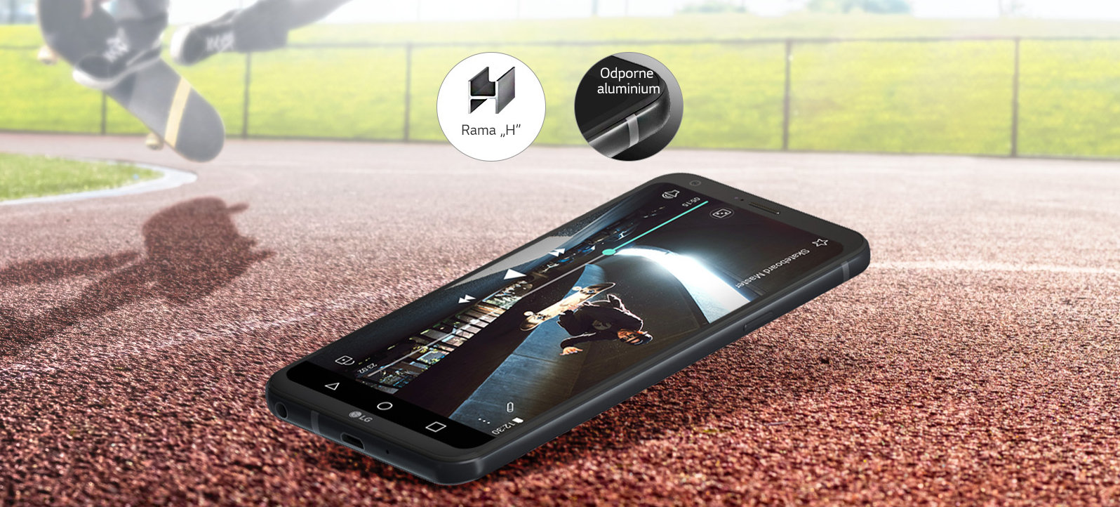 Wytrzymała metalowa ramka Mocny z każdej strony Metalowa obudowa telefonu LG Q6 została wzmocniona przez zastosowanie lekkiego i niezwykle mocnego aluminium serii 7000, uformowanego w tzw. "ramę H". Dzięki temu telefon lepiej znosi uderzenia z każdej strony. |