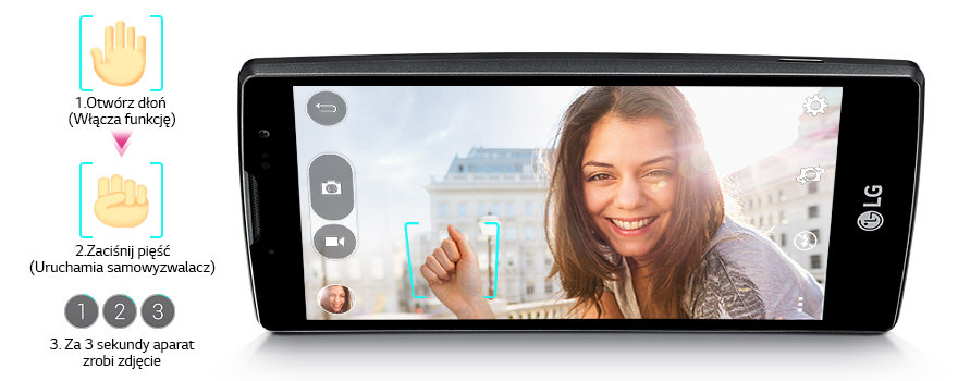 Aby włączyć aparat, wystarczy otworzyć dłoń przed obiektywem. Gdy zaciśniesz pięść, samowyzwalacz rozpocznie odliczanie, pozwalając na przygotowanie się do zdjęcia.