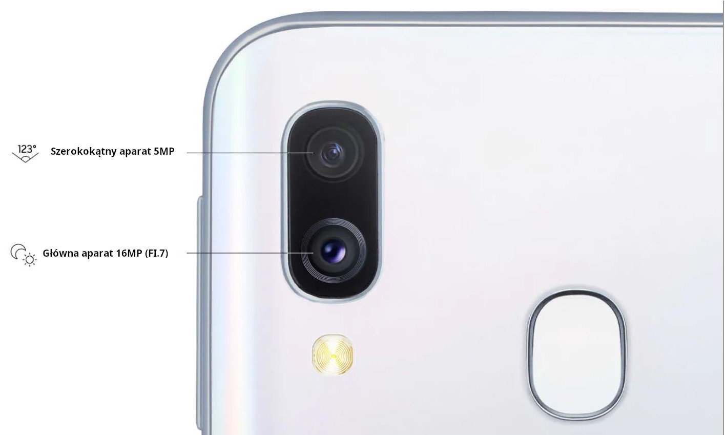 Niesamowity podwójny aparat w Galaxy A40 składa się z aparatu 16 MP (F1.7) i ultraszerokokątnego aparatu 5 MP o 123-stopniowym polu widzenia. Dzięki niemu uchwycisz każdą scenę tak, jak widzi ją ludzkie oko i uwiecznisz każdą chwilę wartą wspomnień.